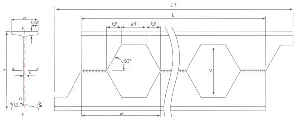 Castellated beams are manufactured by cutting a hotrolled beam (H andI) lengthwise, using computer controlled machine, often in a half-circle or half hexagon pattern. The split halves are then offset and welded back together to from a deeper beam with full circular or heagonal shaped web openings. The resulting beam is approximately 50% deeper and much stronger than the orginal hot rolled beam Bay Steel and Iron offers castellated beams for highly architecturak and cost-effective structural option. Because of our experience and engineering knowledge we are manufacturing different size castellated beams upon request of our customer, alse we provide to our customer engineering and technical support catellated beam