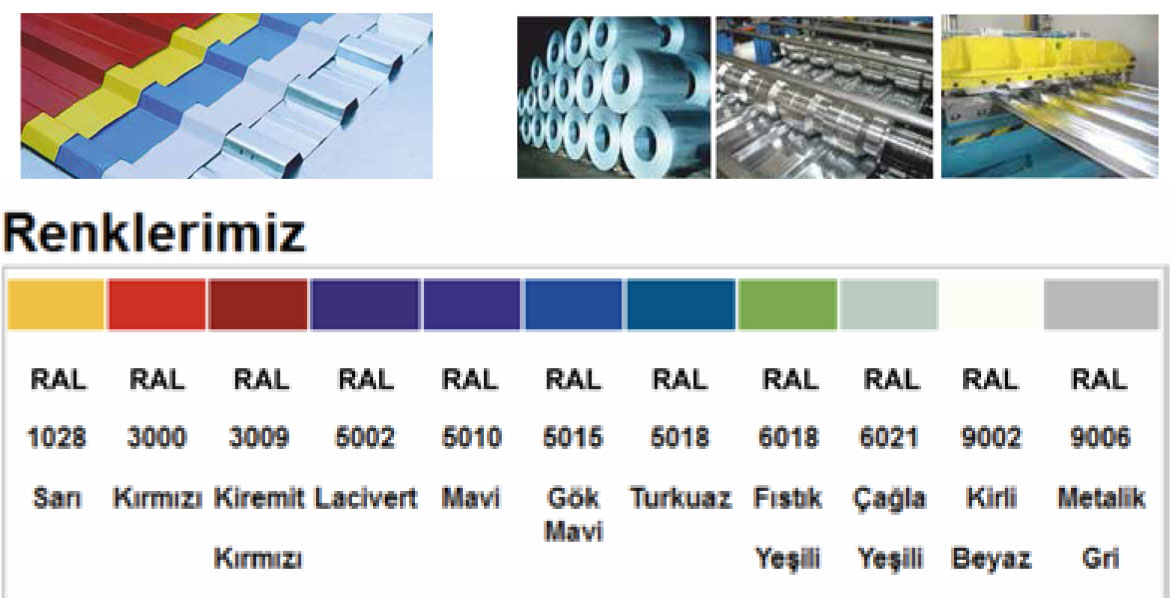 Corrugated Galvanized (trapez sac) Corrugated galvanized iron is a material composed of sheets of hot-tip galvanized mild steel,coldrolled to produce a linear corrugated pattern in them. The corrugations increase the bending strengthof the sheet in the direction perpendicular to the corrugations, but not paralel to them. In 2010 Bay steel and iron start to produce corrugated sheet metal upon to customer demands. Max capacity is 1.2 mm and lenght is 16000 mm and able to produce all color and galvanized type and two different width 1000mm and 1200mm. Corrugated sheet metal is ideal for roofing cladding with multiple advantages: it is long lasting, economical, robust, light-weight practical and adapt easily to all types of constructionwork. Bay steel has capacity to produce different size and amount of corrugated sheet metal is giving technical and engineering support to all customers.